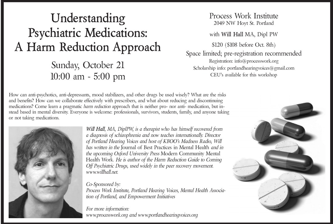 Download flyer here: http://www.portlandhearingvoices.net/files/PsychMedicationsWorkshopOct21-2012WillHall.pdf